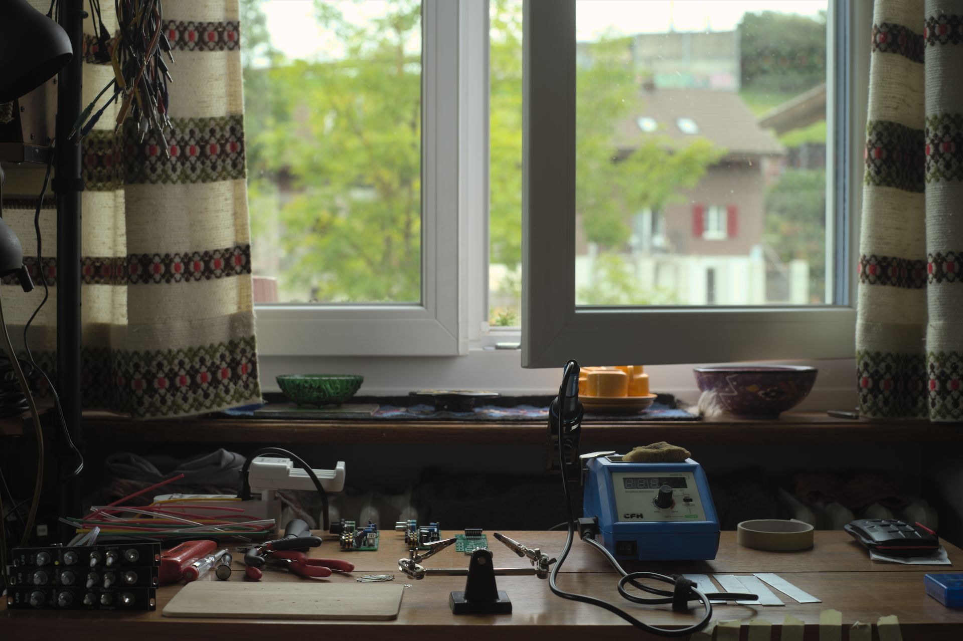 Then I attended a workshop at the Acid Solder Club where I built two 'Micro Dosers' by Error Instruments. For that digital glitchy noise. Next came about 3 LFOs and VCFs also by David. Finally I soldered a Chroma Cauldron Wave Comber to process analog video. I use my camcorder to record and old beamers to project.
