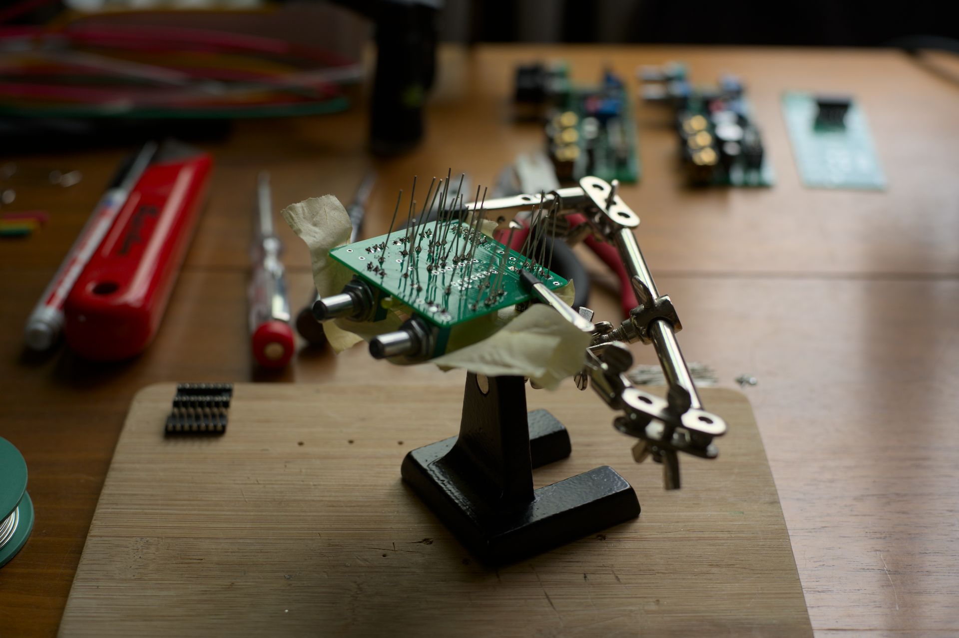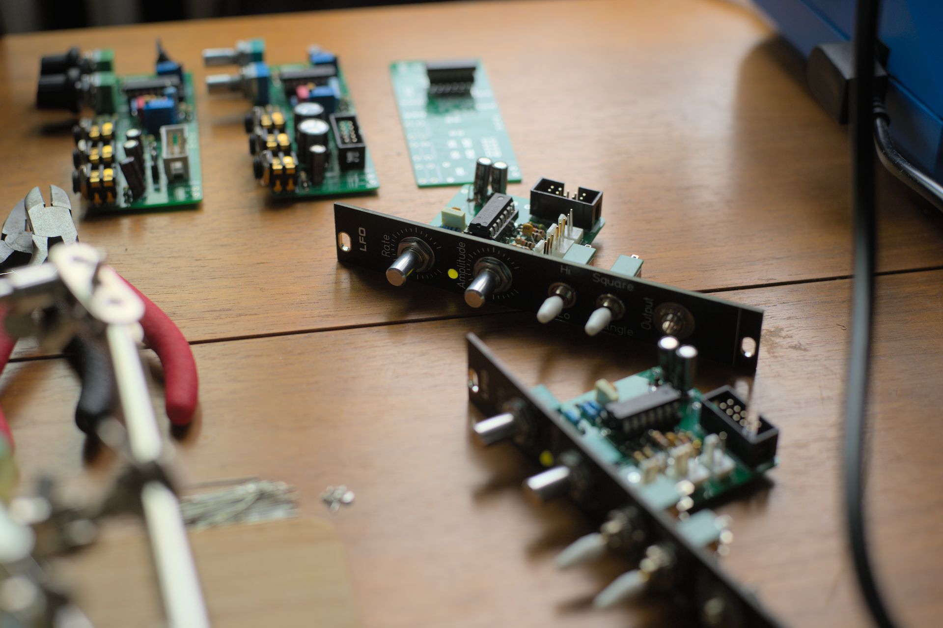 The first few modules I soldered were 4x oscillators, designed by David Haillant. Front Panels are easily made from thrifted alu panels, and an alu scissors. Pretty fun project actually, satisfying to have made my own panels.